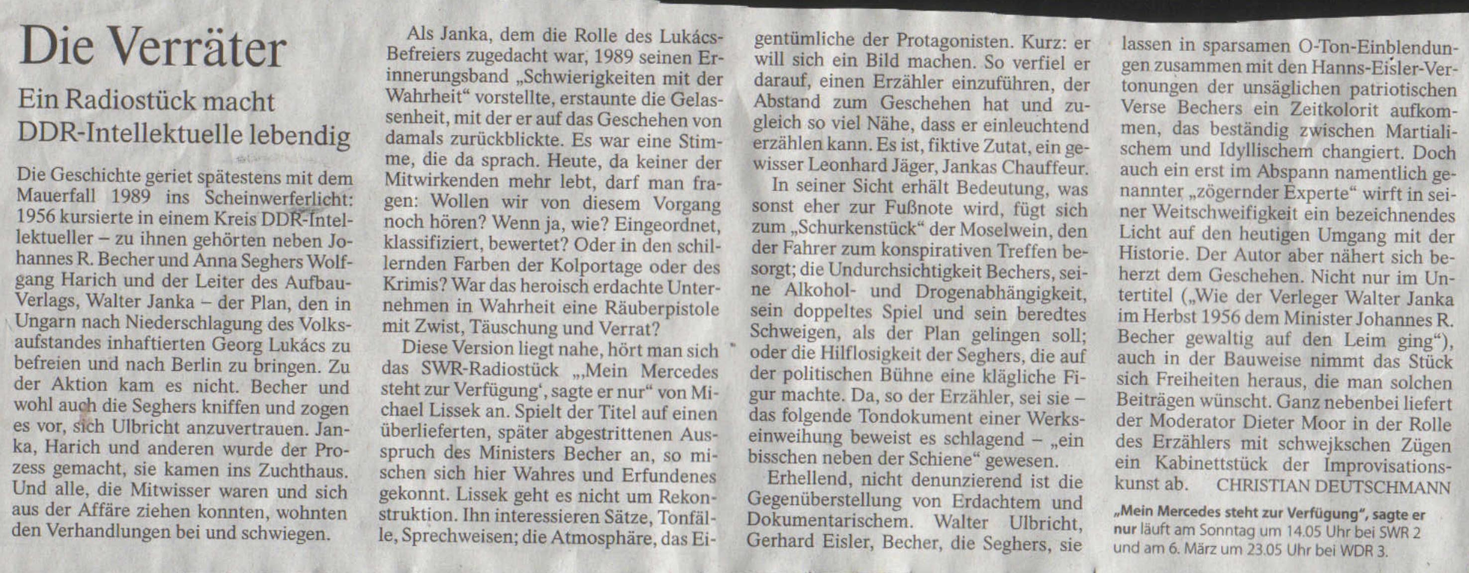 und janka überqueren eine straße. im hintergrund kommt ein bus. diese unglaubliche geschichte, die walter janka 1989 in seinen erinnerungen beschreibt und stefan heym schon 10 jahre früher zu einer szene in dem roman "collin" ausbaute, benötigt einen geschmeidigen erzähler. einen, der überall dabei war und intimkenntnisse der protagonisten hat: den chauffeur leonard jäger, der janka noch aus dem spanischen bürgerkrieg kennt und hin und wieder auch der chauffeur anna seghers war. den die geschichtlichen umstände ans "steuerrad der mächtigen" gespült haben... dank der spielfreude des schauspielers dieter moor, der die rolle des chauffeurs besetzt, ist "mein mercedes steht zur verfügung" zu einem intensiven spiel von fiktion und realität geworden; zu einer auslotung der möglichkeiten des ERZÄHLENS im akustischen radiofeature.